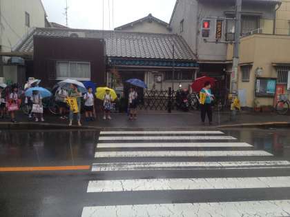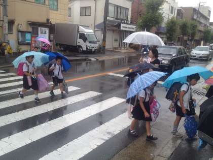 今朝は、登校時間帯が一番雨が強く降っていました。保護者の見守りに加えて、更生保護女性会の方々も横断歩道で、子どもの安全を見守ってくださいました。ありがとうございます。