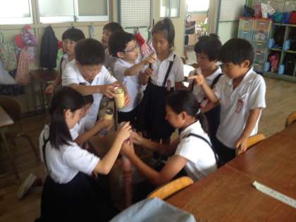 大きいかんと小さいかんどちらかを選んで時間内にかんをたくさん積む競争です。上下を逆にすると、なかなかつみあげることができず、どのチームも協力して挑戦していました。