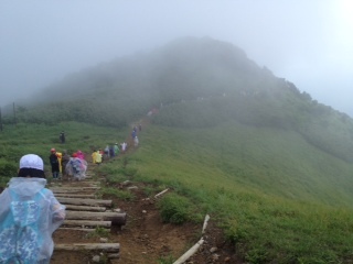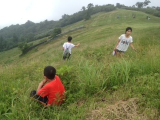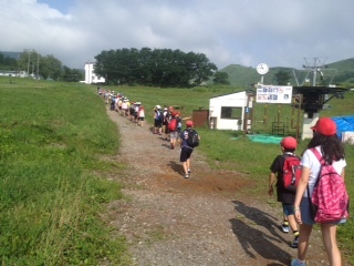 いよいよ山登りです班の友達と励ましあいながら、山頂目指して登っていく子どもたち。山頂には、きれいな景色と素晴らしい感動が待っているはず。