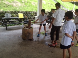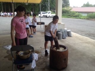 餅つきをしました。子どもたちの元気なかけ声が高原に響き、楽しい気持ちになりました。おもちを豚汁雑煮に入れると、ほっぺが落ちるくらい美味しかったです。