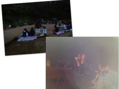 1日目のキャンプファイヤー開始直前の様子です。班ごとにスタンツを準備、練習していましたが、みんな、うまくできるかちょっとドキドキ、そそわそわの時間。はやく暗くならないかな〜。この後、アフロ兄さんが登場したり、おもしろいキャラクターや怖い顔が笑わせてくれたりと、大盛り上がりでした!少しくらいの練習不足もそこは、名司会が気の利いたコメントでカバー。みんなで楽しもうとするところは、さすが5年生!