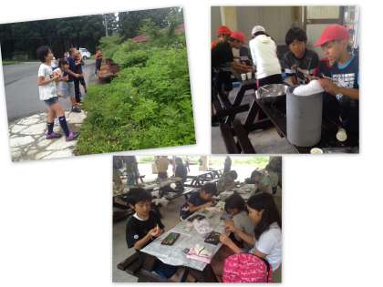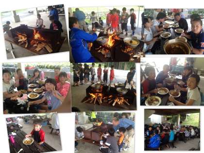 カレー作りは、みんなが協力しなければできない大仕事。雨上がりでマッチが少し湿気ていて、なかなか火がつかず、苦労していました。かまど作りも四苦八苦。普段ガスコンロですぐ火がつくのが当たり前の子どもたちにとっては、貴重な体験でした。火加減もスイッチのように簡単にはできず、すごい火が上がった班も。でも、みごと、どの班もおいしいカレーが出来上がりました。すすで黒くなった顔もかわいいでしょう!?