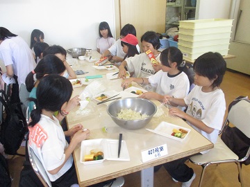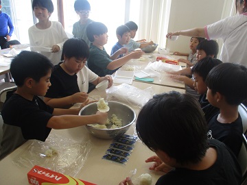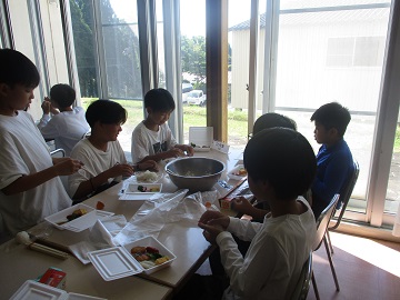 お昼のお弁当をつくります。玉子焼きやシャケなどのおかずとともに、おにぎりを自分で握って、お弁当箱に詰め合わせます。