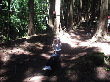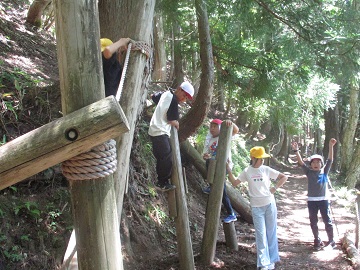 森の中のアスレチックは、けっこうスリリングなアイテムもあります。子どもたちは、思ったより安全第一で楽しんでいました。