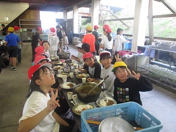 活動班のみんなで協力して作り上げたカレーが、ついに完成しました。みんな笑顔で「いただきます!」