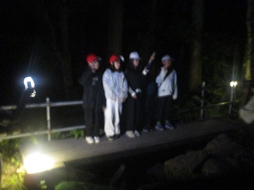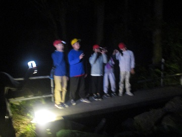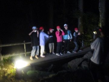 そして、活動班ごとに真っ暗な森の入り口で写真撮影をして、ナイトハイクに出発していきました。左手のロープだけを頼りに、真っ暗な山道を歩いていきます。川の音、虫の声・・・昼間には感じることのできないハチ高原の自然とふれあうことができました。