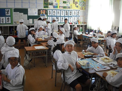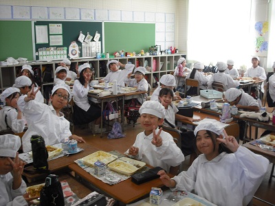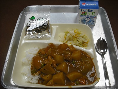 子どもたちの大好きなカレーライスです。4年生の子どもたちは、みんな食べるのがとても速いです。カレーは飲み物? しっかりと噛んで食べましょうね。子どもたちは次々におかわりをして、食缶はあっという間に空っぽになりました。