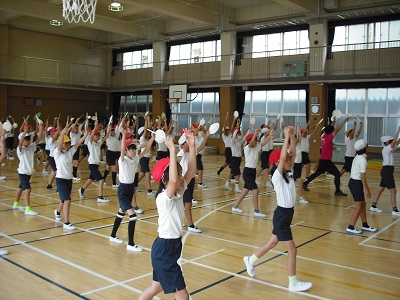 講堂では5年生が、団体演技のエイサーの練習をしていました。太鼓(パーランクー)とバチの代わりに、紙皿と割りばしを持って先生の指示に従って動きを練習していました。