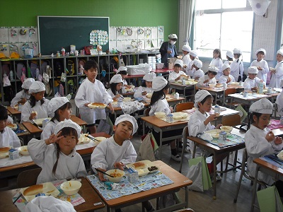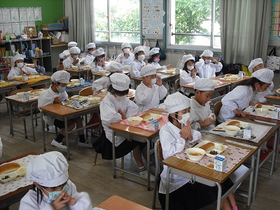 1年生の子どもたちも梨の給食を喜んでいました。そしてその梨と同じくらい人気なのがスープスパゲッティでした。「お増やし」の行列ができていました。