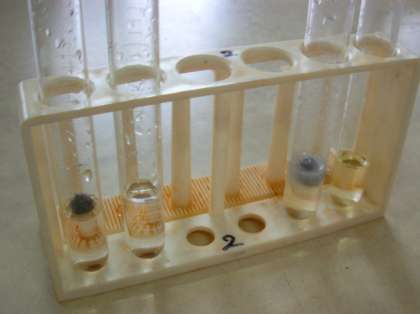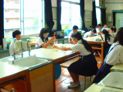 6年生は理科室で、塩酸がアルミニウムや鉄を溶かす様子を観察する実験をしました。安全のため、実験をする際には、みんな保護メガネをして実験をしました。