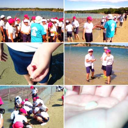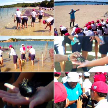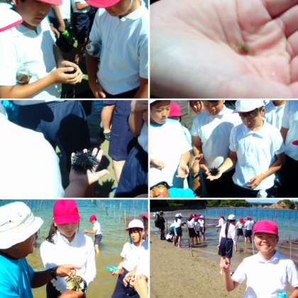 生き物観察では、指導員の先生に教えていただき、ウミニラが海水をきれいにする実験をしたり、ムラサキウニを手にとって観察したりしました。そして、子どもたちが熱中したのは、浅瀬でいろいろな生き物を見つける活動です。ヤドカリやウミニラなどの小さな海の生き物を捕まえました。