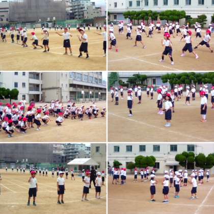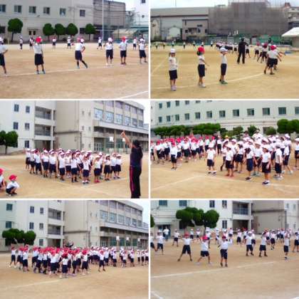 1年生が運動場で演技の練習をしていました。