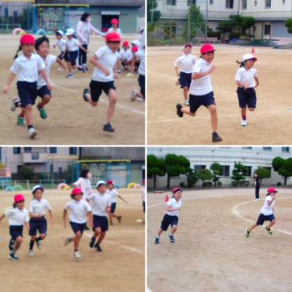 2年生の走競技の練習です。運動場のトラックを半周程度走ります。