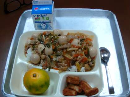 今日の給食は中華メニューです。午前中は各学年運動会のリハーサルでエネルギーを消費したと思うので、しっかりと食べてください。