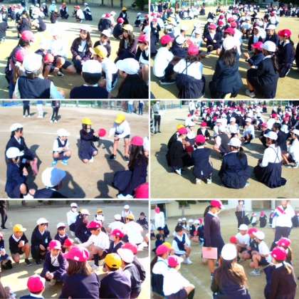 各グループの6年生が下の学年の子どもたちをリードして、みんなでゲームを楽しみました。今日は青空が広がる快晴で、外はとても気持ちが良い気候です。運動場はたくさんの子どもたちの笑い声が響いていました。