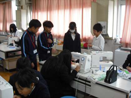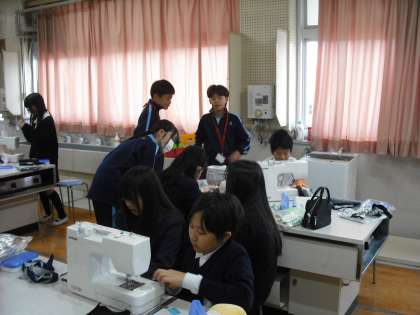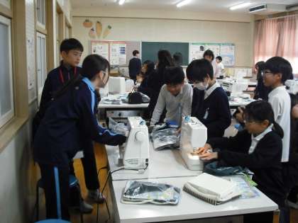 早速5年生の家庭科のミシンの実習のお手伝いをしてもらいました。5年生の子どもたちは、ミシンを使ってオリジナルデザインのエプロンを縫っています。中学生の3人はヘルプを出しているグループへ行くなど、活躍してくれていました。