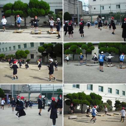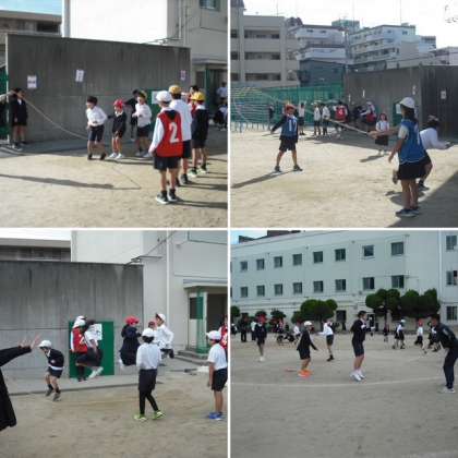 今日は2、4、6年生が15分休み、1、3、5年生が昼休みに、全員が運動場に出てなわとびに取り組みました。初級、中級、上級、長縄とエリアを分けて、運動委員会の子どもたちがアドバイスをして、なわとびの技術を高めていきます。先生たちも子どもたちと一緒になわとびをしていました。