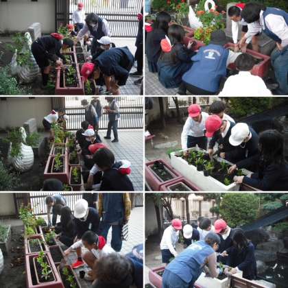15分休みに集まってきた飼育栽培委員会の子どもたちは、しっかり育ったキンセンカ、ノースボール、パンジー、ビオラの苗を大きな鉢に植え替える「鉢上げ」を行いました。