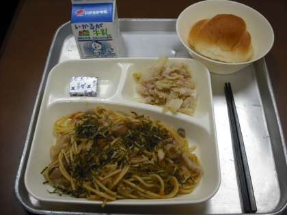 子どもたちの大好きなウインナーの入ったスパゲティです。3年生の教室では、スパゲティにチーズをインして子やスパゲティパン?にしている子もいました。みんないろいろアレンジしています。