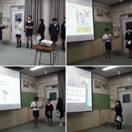 学校保健委員会を実施しました。今回は、健康委員会の子どもたちの行っているけがを減らす活動をスライドで発表しました。発表の中には健康委員会の子どもたちが登場するおもしろい動画があり、どのようにすればけがを防ぐことができるのかがよくわかりました。