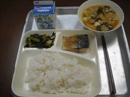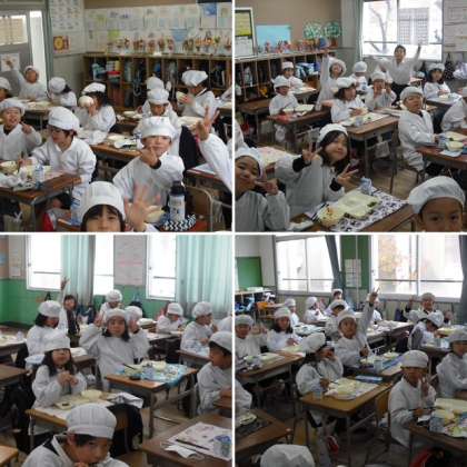 日本の家庭のお昼ごはんという感じの献立です。2年生の子どもたちは、意外とお魚をしっかりと食べていました。みんな良い笑顔です。