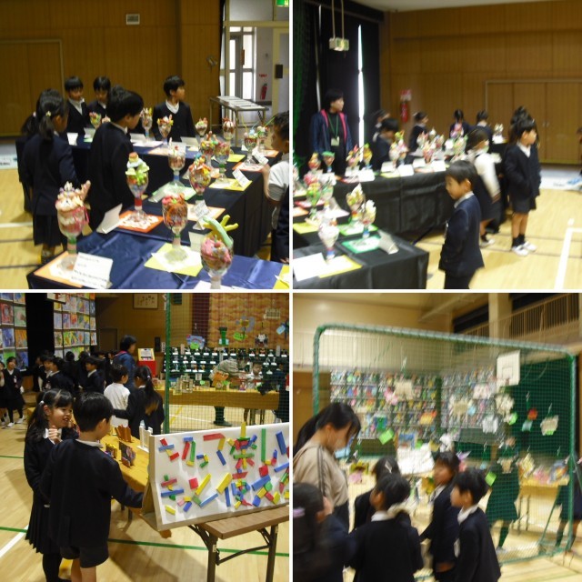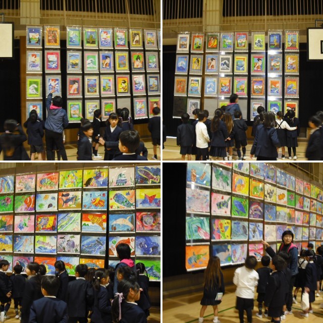 今日から作品展が始まります。それぞれのクラスでもまとまって作品展の見学をしています。1年生のクラスが作品展をワクワクした様子で見学をしていました。上の学年のお兄さんお姉さんの作品をじっくりと見て感想を記入している姿もありました。自分のきょうだいの作品を探している子どもたちもたくさんいました。