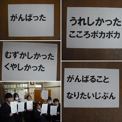 終業式の校長の話は、2学期を振り返って「がんばったこと」「うれしかったこと」「むずかしかったこと」の3つをそれぞれの子どもたちに考えてもらいました。そして3学期に「がんばること」「なりたいじぶん」を想像してもらいました。2学期のさまざまな経験が力になっています。それを大切にして、3学期へ進んでいってほしいと思います。