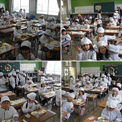 久しぶりの給食です。食感の良いあじ、温まるスープ、とても美味しいです。1年生の子どもたちもしっかりと食べていました。
