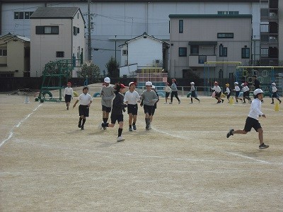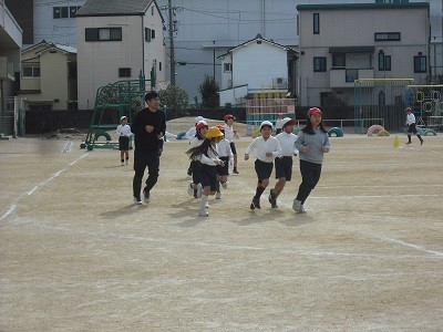 今日は昨日までと打って変わり、とても寒い一日です。そんな寒い中ですが、3年生の子どもたちは、体育の授業でかけ足をしています。先生と一緒にクラスのみんなで、それぞれが自分のペースでかけ足をしています。