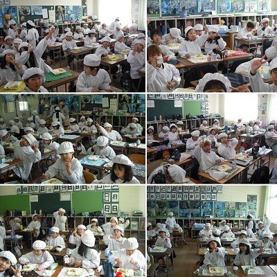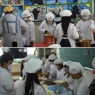3年生では給食当番がしっかりと役割を果たしてがんばっていました。みんな美味しく楽しく給食を食べています。