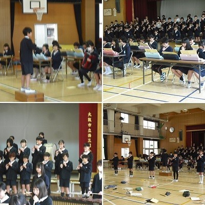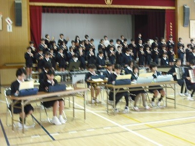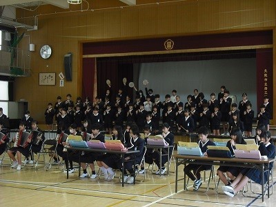 6年生が講堂で、学習参観で行うファイナルコンサートに向けて、学年全体で合奏の練習をしていました。今週はインフルエンザの影響で学級休業となっていたクラスもあり、久しぶりの学年全体での練習となりました。