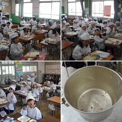 2年生の子どもたちも「くじら おいしい!」と言って、たくさん食べていました。食缶は空っぽです。ザ昭和の給食献立でした。