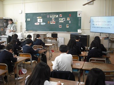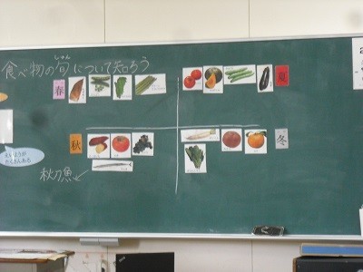 たけのこ、かぼちゃ、さんま、ほうれん草・・・など、どの季節の旬の食材になるかを考えて発表しました。子どもたちは、積極的に発表して楽しく学習していました。給食の時に旬の食べ物の学習を思い出して、しっかりと栄養をとって丈夫な体を作りましょう。