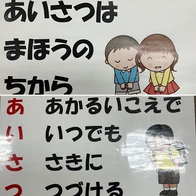 今日から意識してほしい「あ・い・さ・つ」の合言葉を伝えます。「あ」:あかるいこえで、「い」:いつでも、「さ」:さきに(自分から)、「つ」:つづける(明日も明後日も)