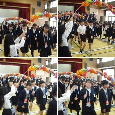 1年生から5年生が大きな拍手で迎える中、6年生が花のアーチをくぐって入場しました。最初に1年間一緒に活動した「たてわり班」の1,2年生より、6年生にお祝いのメダルを渡しました。そして1年生から5年生までの子どもたちで「花束をあなたに」を歌い、各学年それぞれから6年生に「ありがとう」の気持ちを、とても大きな声で呼びかけました。