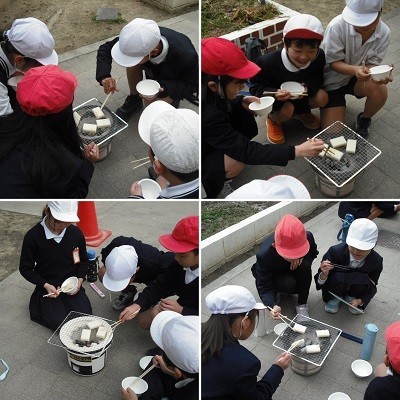 今日は七輪でお餅を焼いて食べる体験です。表面が色づいて、膨らんできて、炭火の香りとともに、お餅が美味しそうに焼けていきました。焼きあがったお餅にしょうゆをつけて「いただきます!」その美味しさに、みんな笑顔がいっぱいです。