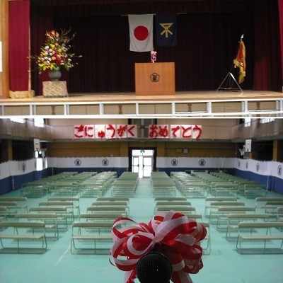 明日の入学式に向けて、新6年生と新2年生が登校しました。新6年生は会場準備と校内清掃、新2年生は入学式の中で行う「歓迎演技」のリハーサルを行いました。