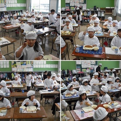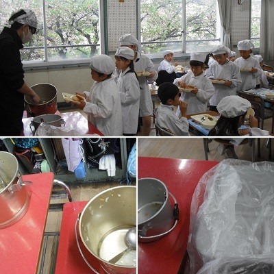 少しお兄さんお姉さんになった2年生、おかずを増やしてもらうのに並んでいます。食缶は空っぽになりました。みんなよく食べるようになったね。