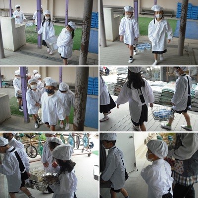 1年生も給食当番をがんばっています。最初は6年生のお兄さんお姉さんや先生たちに給食を運んでもらっていましたが、今は自分たちで運んでいます。少し重たそうですが、落とさないようにね。