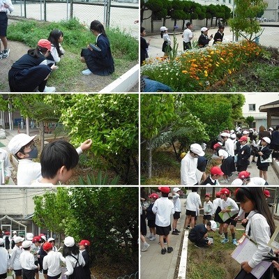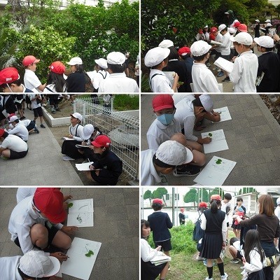3年生4年生が、理科の学習で校庭の生き物を観察しています。この季節は校庭にはさまざまな花が咲きほこって、とてもきれいです。蝶々などの昆虫も集まってきます。子どもたちは植物をよく見て、丁寧にスケッチをしていました。