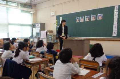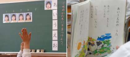「あ・い・う・え・お」の口の開け方や発音について学びました。ちょっと恥ずかしそうでしたが、教科書を持ち、しっかり声を出して学習することができました。