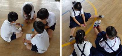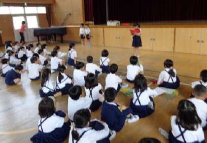 1年生は幼稚園や保育所とは違う小学校のいろいろな場所に興味津々、とても楽しそうでした。たんけんを終えたグループは講堂にもどり、1年生と2年生で折り紙をしたりけん玉をしたりして遊びました。みんな満面の笑顔でした。