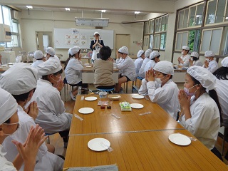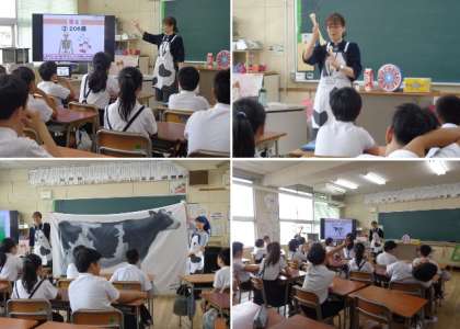 先週の1年生に続き、今週は6年生が雪印メグミルクからゲストティーチャーに来ていただき、出前授業とチーズづくり体験を行いました。