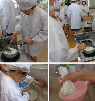 温めた牛乳にレモンの搾り汁を入れてかき混ぜると、白いかたまりと透明な液体に分離します。これをこすとカッテージチーズのでき上がりです。どのグループもチーズはばっちり完成して試食タイム。イチゴのソースやしょうゆ、かつお節などと合わせて食べてみました。くせのない味で、みんな美味しくいただきました。