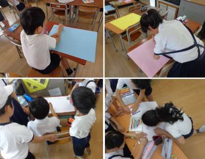 今朝は、実際にゲームに必要なものを準備したり、ポスターを描いたりしました。