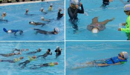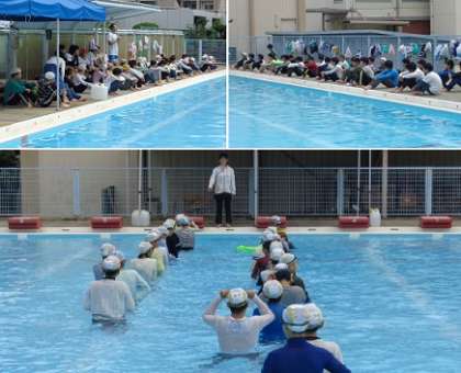 「着衣水泳」は、命を守るための学習です。海や川など水辺に行く機会が多い夏休みを前に、水難事故から自分の命を守るため、どのように行動したらよいか、体験を通して学びます。