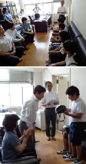 交通安全協会会長からヘルメットとともに、激励のメッセージを受け取った子どもたち。練習にもいっそう熱が入ることでしょう。