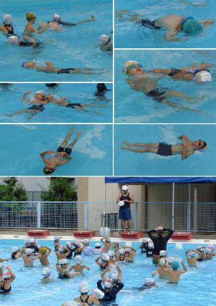 川や海などに転落してしまった際の浮き方や、呼吸確保の方法などを練習しました。うまく「背浮き」の姿勢が取れない児童がほとんどでしたが、ペットボトルを使って救助を待つ練習では、たくさんの児童が上手に浮けるようになりました。
