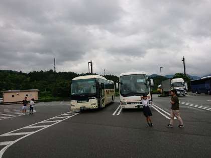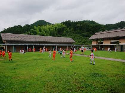 小学生を運ぶバスが多く駐車していました。芝生のサッカー場もありました。