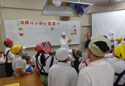 パンが焼けるのを待つ間は、出前授業です。写真や動画を使って、工場でパンが作られるまでの工程や、出荷され学校へ届けられるまでの様子を教えてもらいました。生のイーストのにおいを嗅がせてもらったり、ミキサーでこねたパン生地を触らせてもらったり、なかなかできない体験もさせてもらい、子どもたちは食についてしっかりと学ぶことができました。